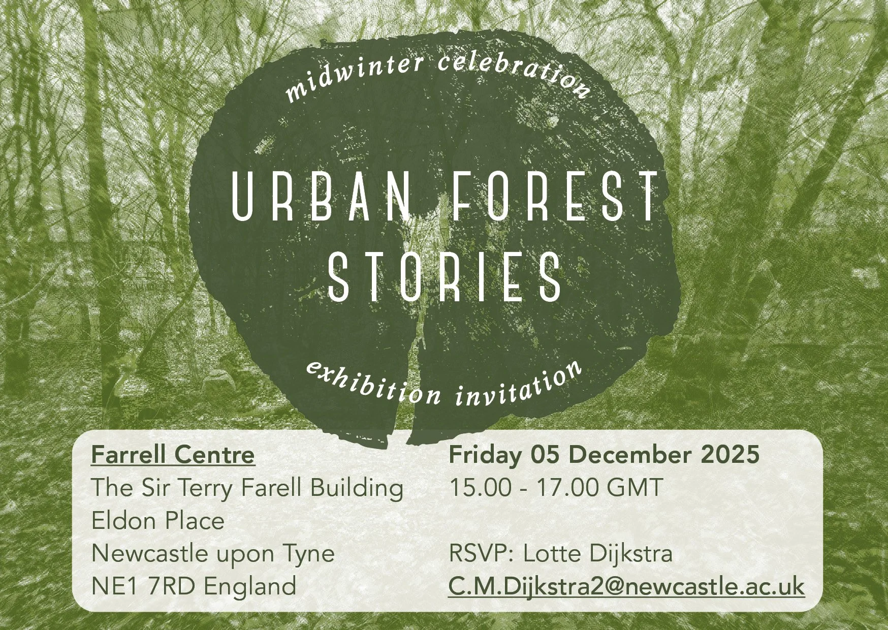 Back to All Events midwinter celebration| exhibition Urban Forest Stories Friday 5 December 2025 15:00 17:00 Farrell Centre Eldon Place Newcastle upon Tyne, England, NE1 7RD United Kingdom (map) Google Calendar ICS Join Midwinter Celebration